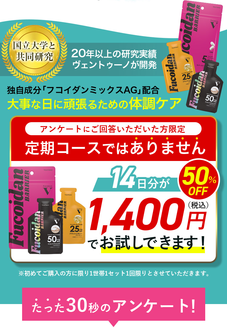 たった30秒のアンケートに答えて特別価格でゲット!フコイダンバリア たった30秒のアンケートに答えて特別価格でゲット!フコイダンバリア